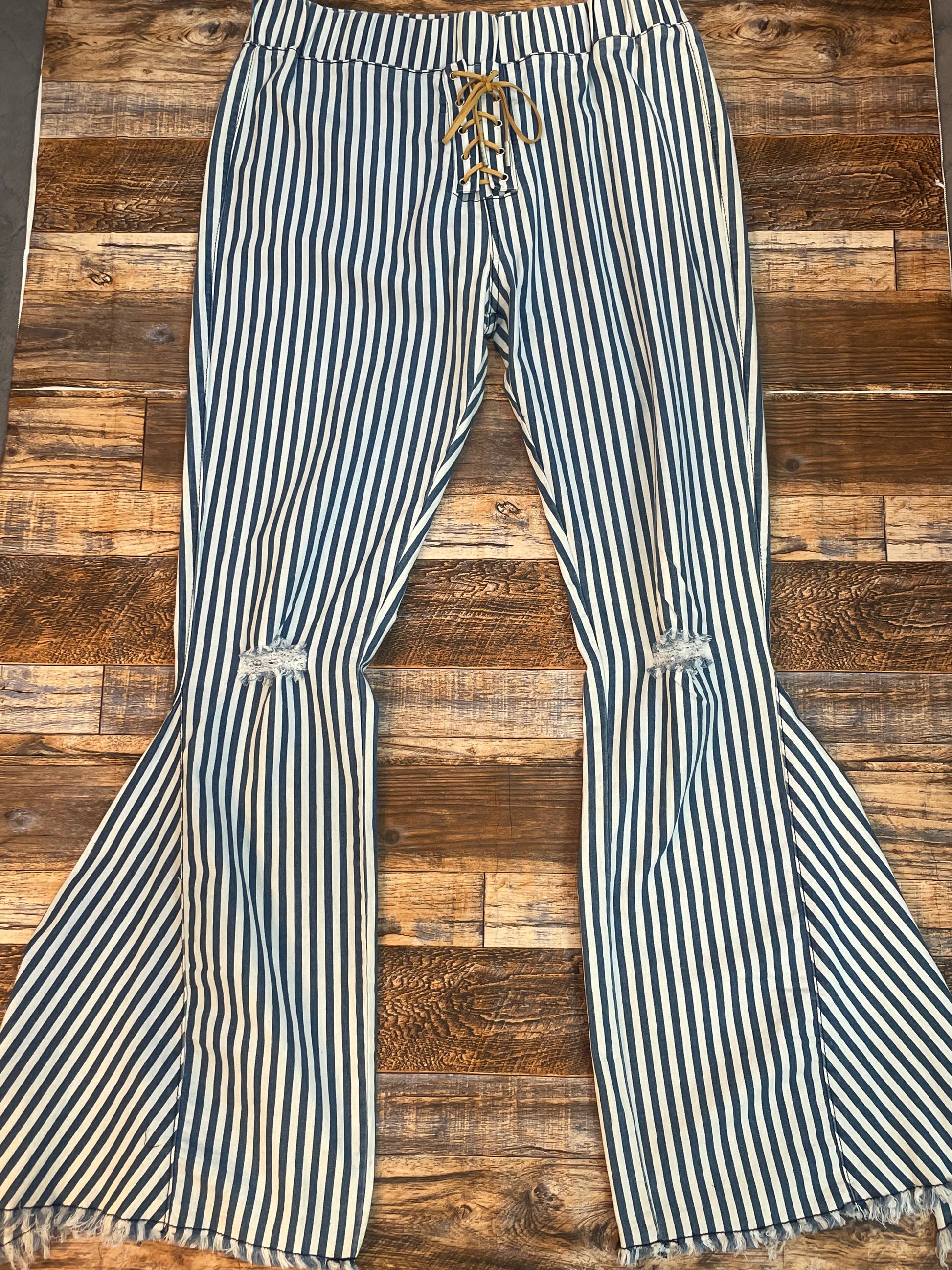 Featuring distressed knees, an elastic waist, and dramatic flare legs for that bold, laid-back vibe.
