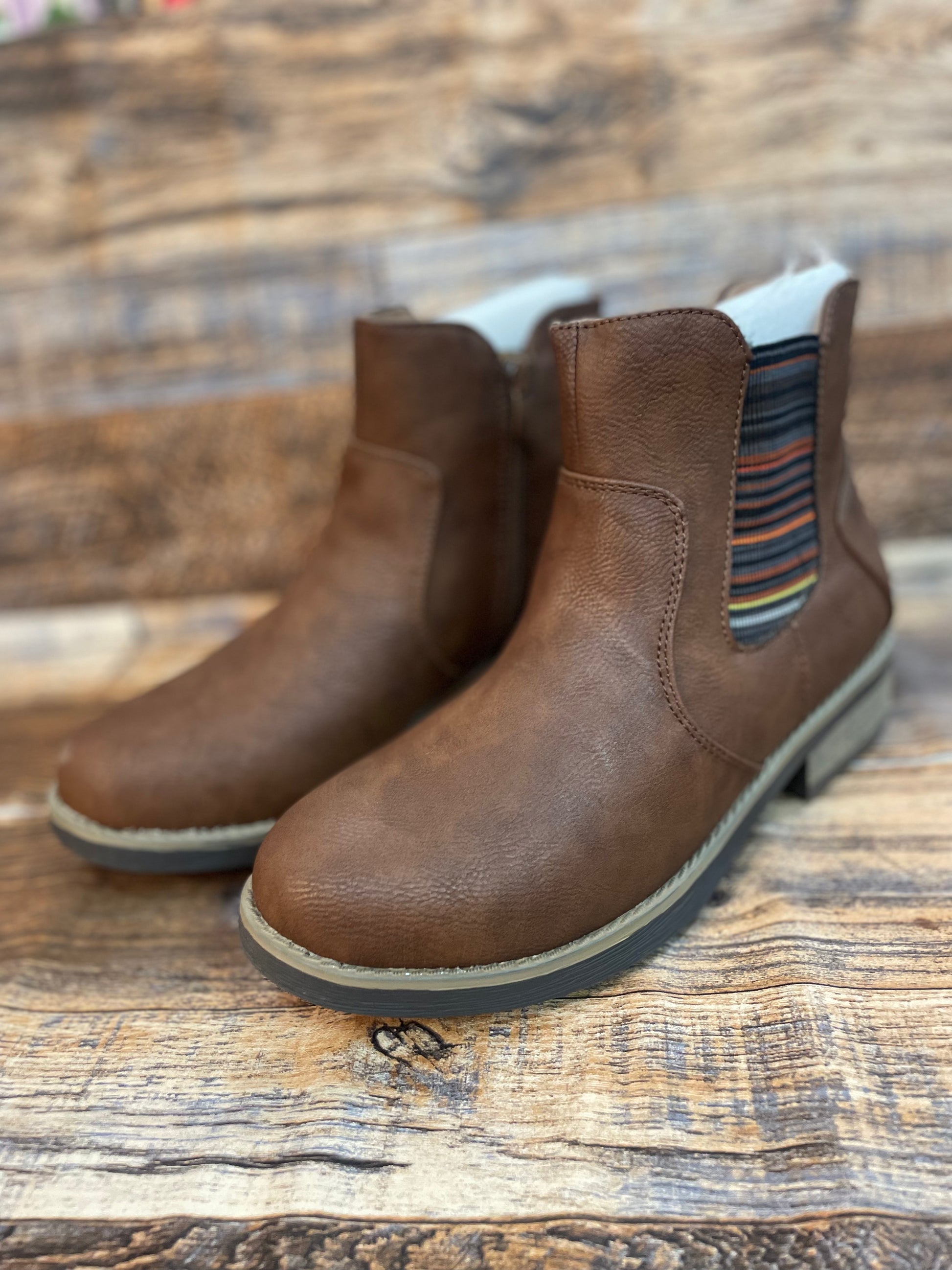 Colorful striped stretchy material on one side and on other side there is a zipper to unzip to put to your foot in. Very durable boot brown color boot. Zipper is located on the inside of the boot. On one side stretchy material the other side a zipper to help put foot in the boot.