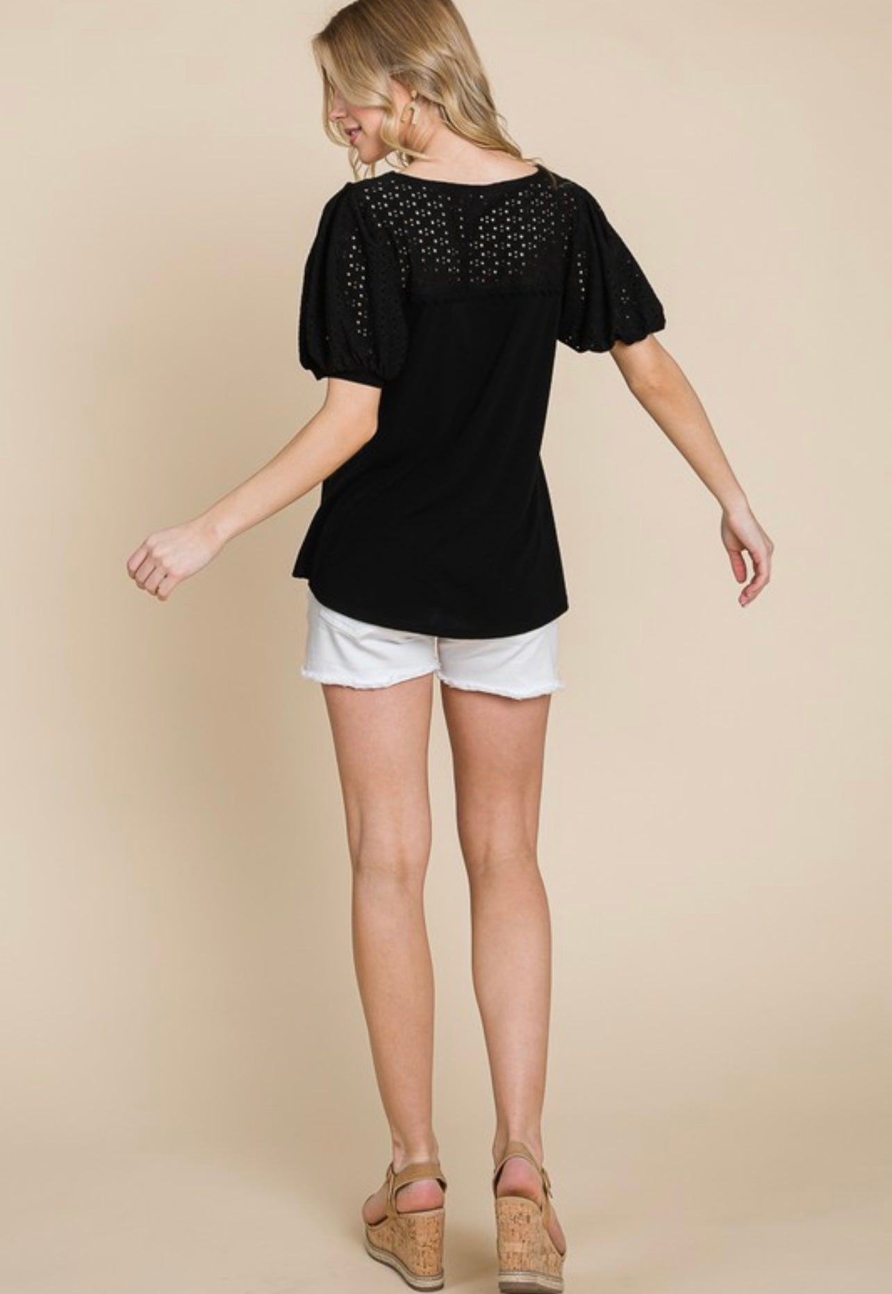- Eyelet Bubble Sleeves: The standout feature of this top is its eyelet bubble sleeves. The sleeves are voluminous, creating a "bubble" effect that adds a touch of drama and femininity. The eyelet fabric, characterized by small, patterned holes, adds texture and a delicate, airy look to the sleeves.