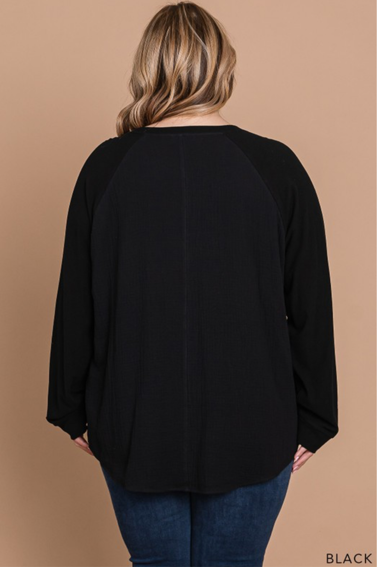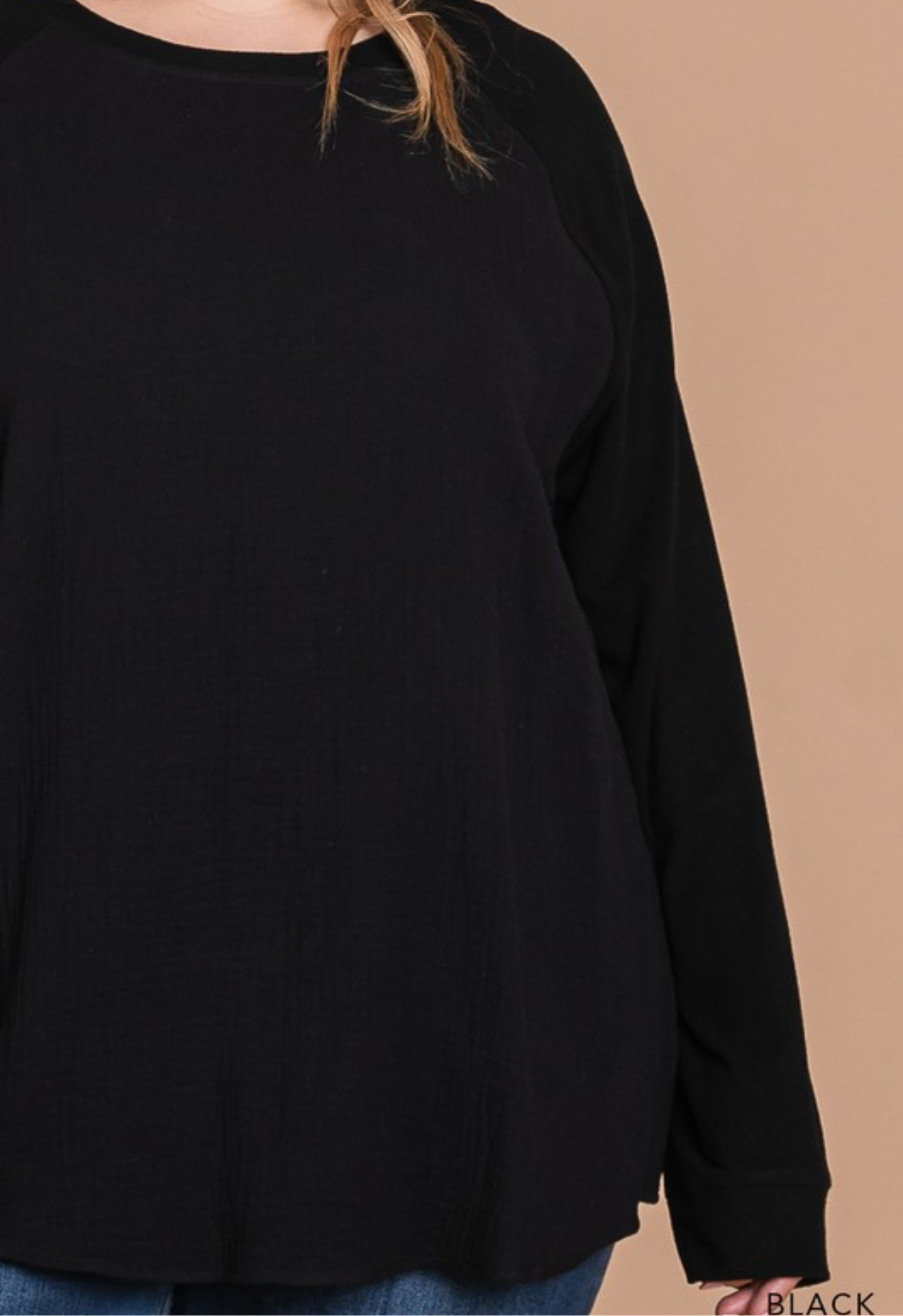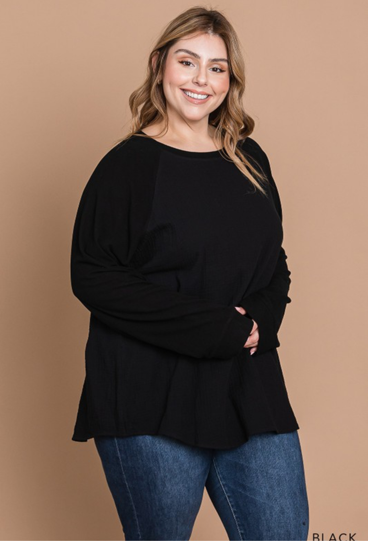 - Contrast Texture: The difference in texture between the gauze body and knit sleeves adds a unique and stylish element to the top.