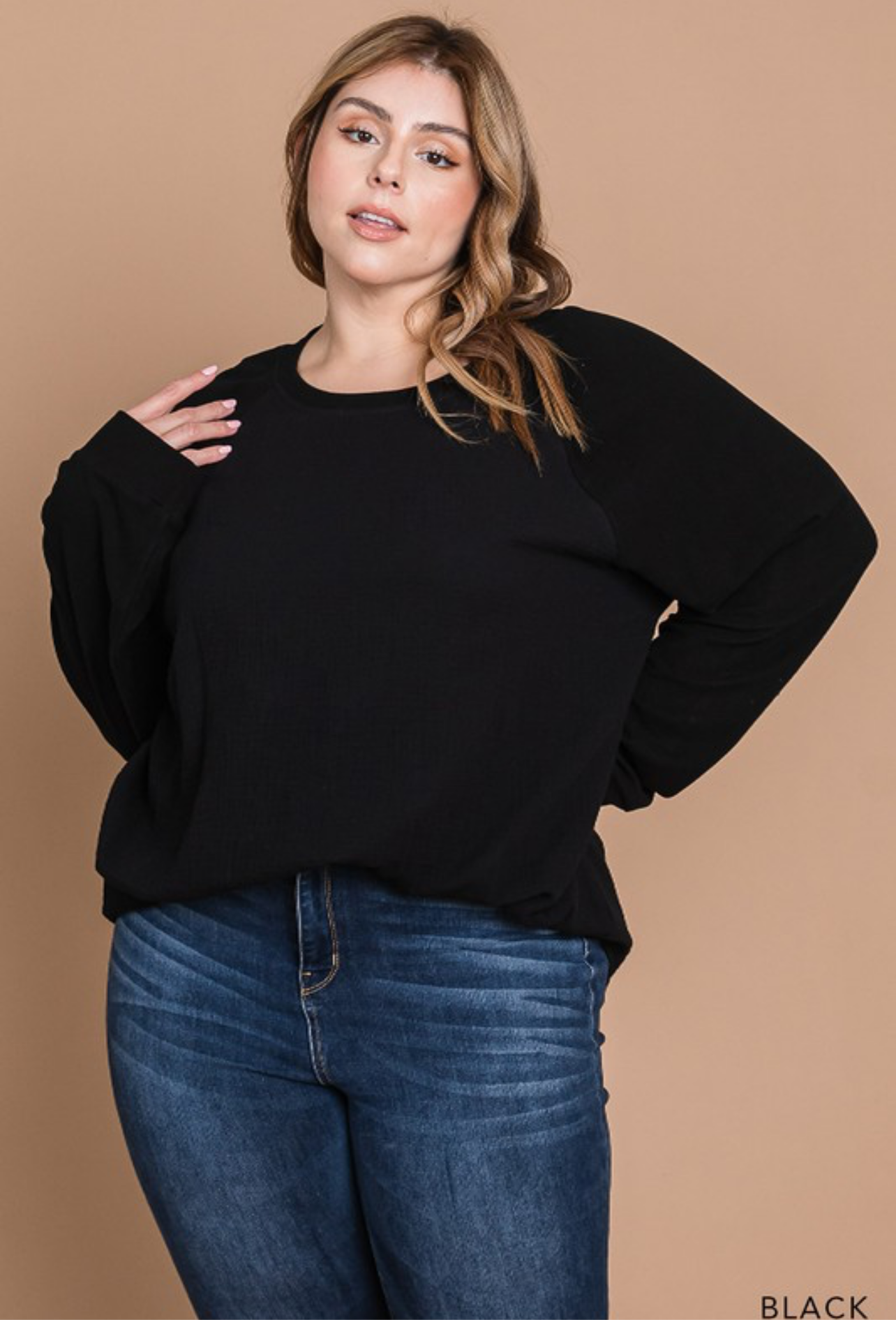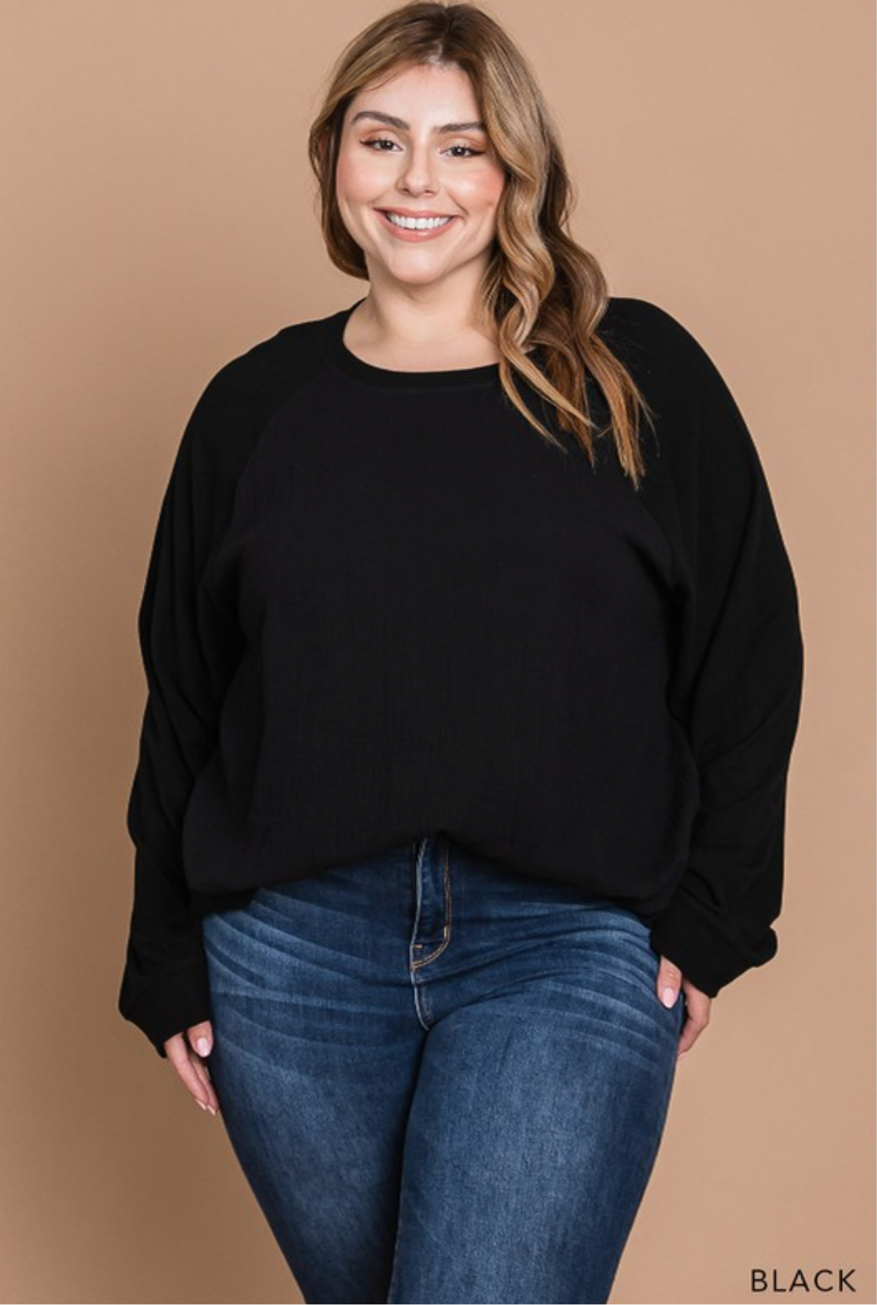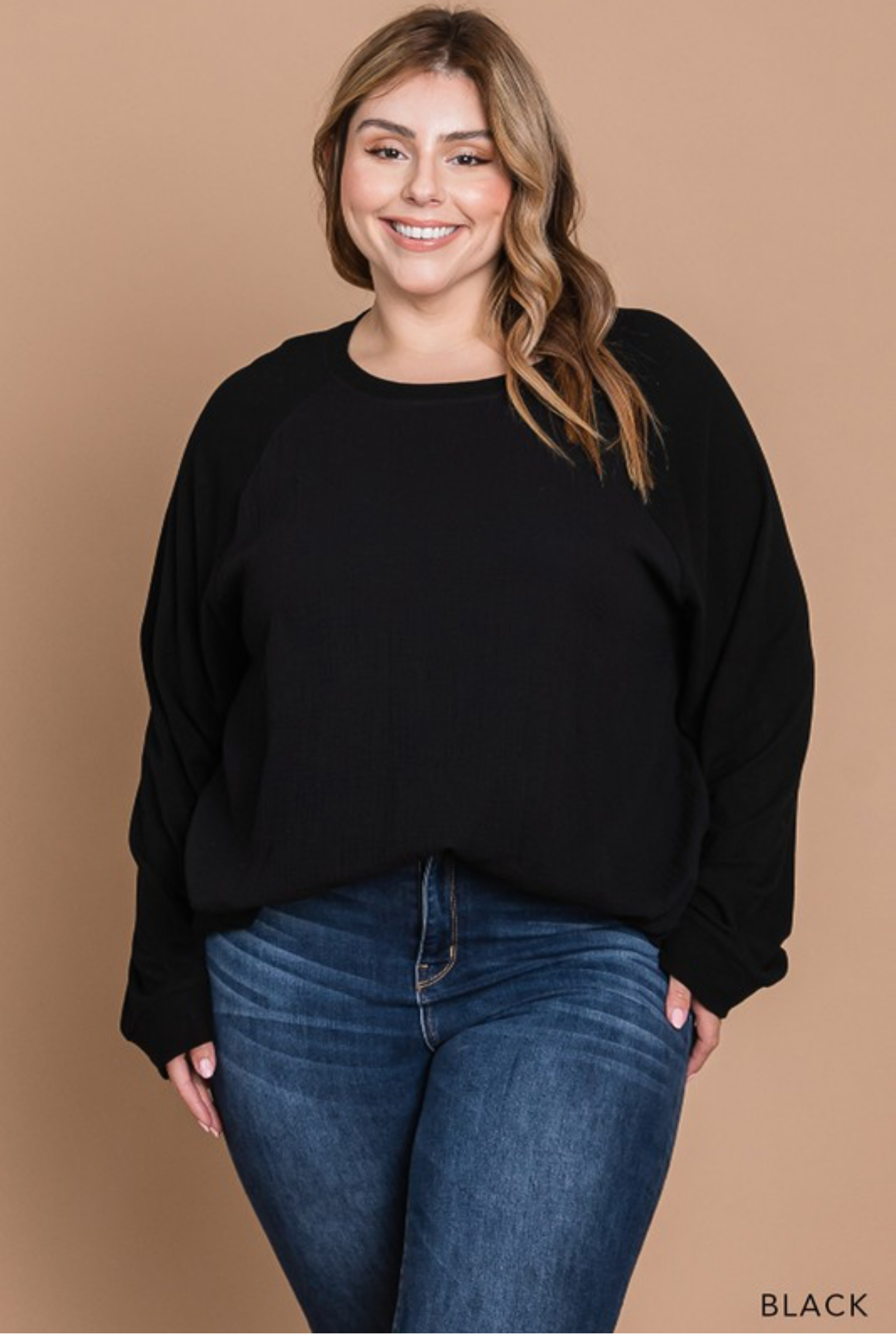 - Contrast Texture: The difference in texture between the gauze body and knit sleeves adds a unique and stylish element to the top.