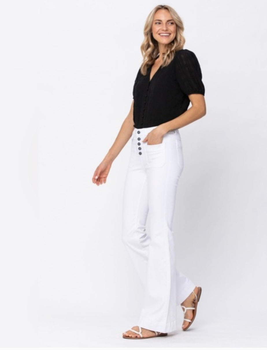 These white Judy Blue jeans are soft, stretchy, and stylish with retro flair.