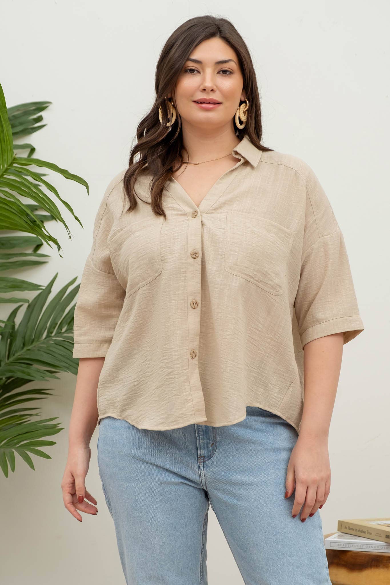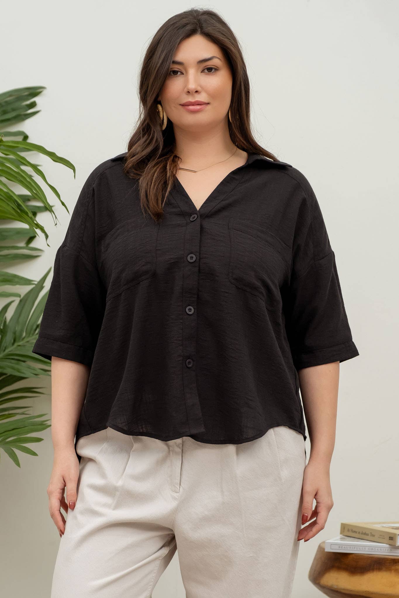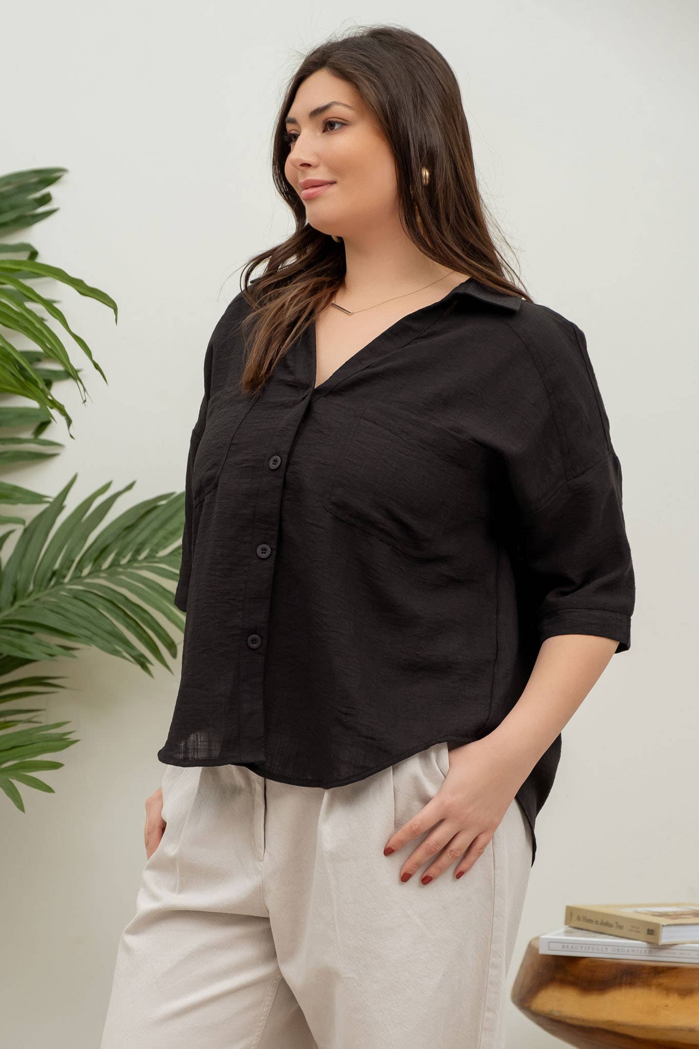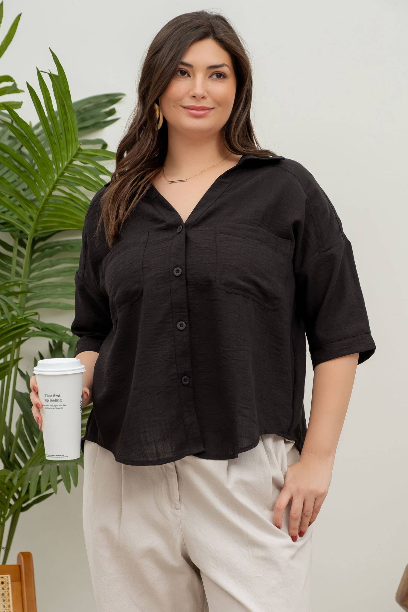 3 1X, 2 2X, 1 3X - COLLARED - SHORT FROP SLEEVE - BACK YOKE DETAIL - BUTTON FRONT - PICKETS - LIGHT WEIGHT - SHEER - SOLID - WOVEN TOP - 100%POLYESTER