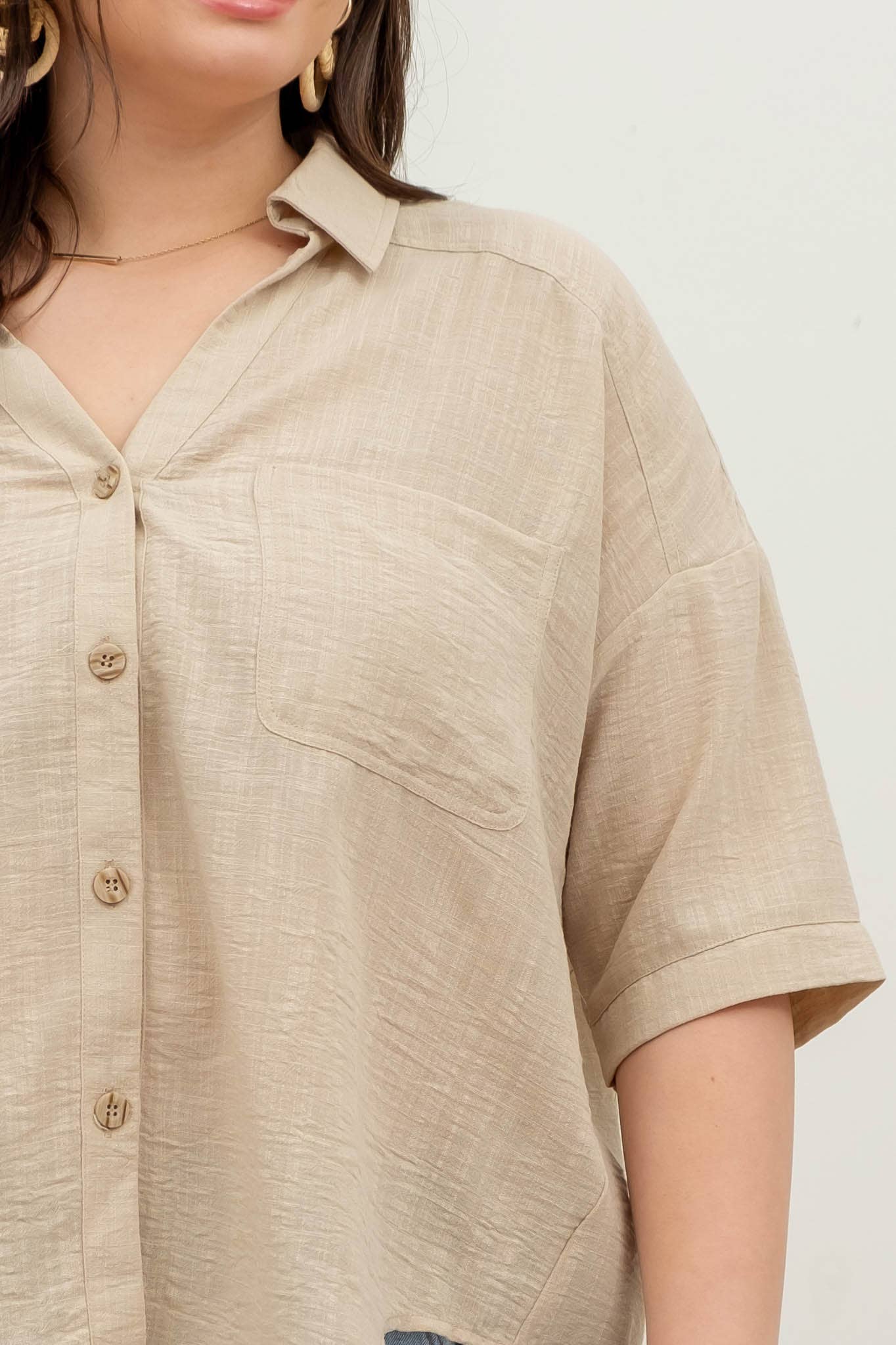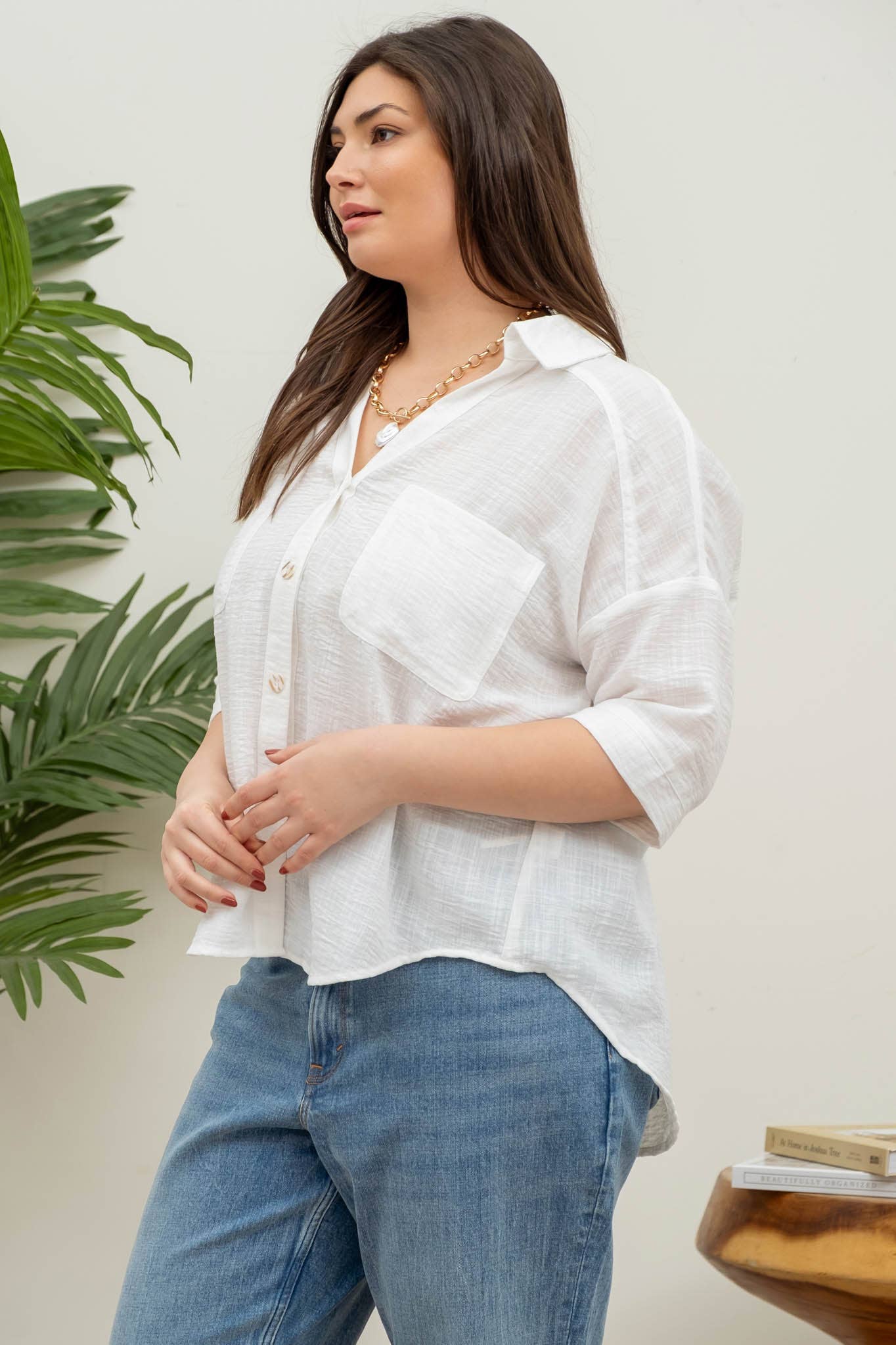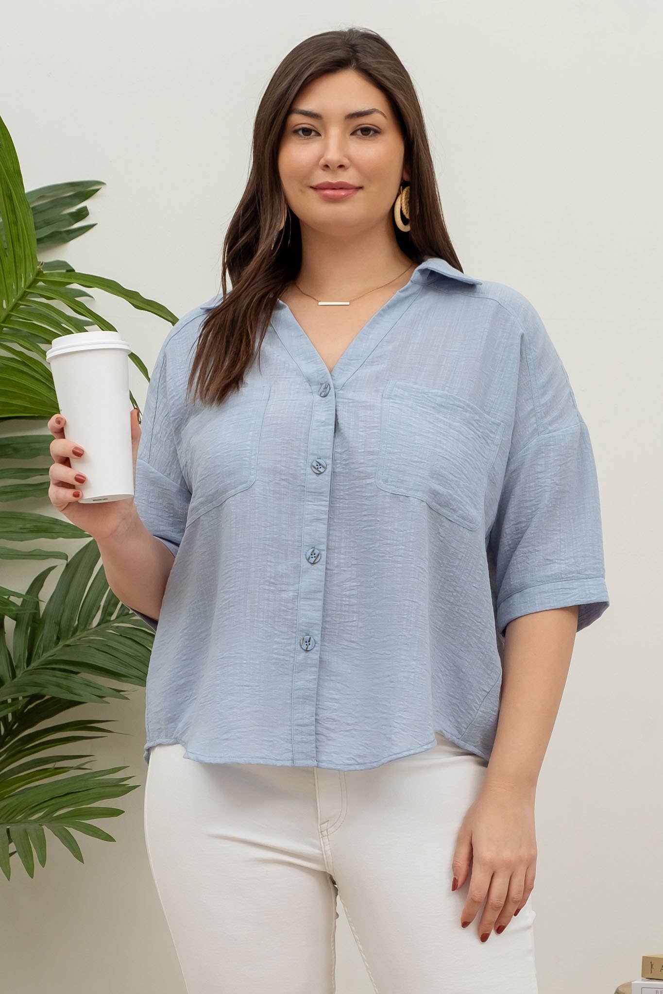 PLUS GAUZE SHORT SLEEVE BUTTON DOWN SHIRT: BLUE