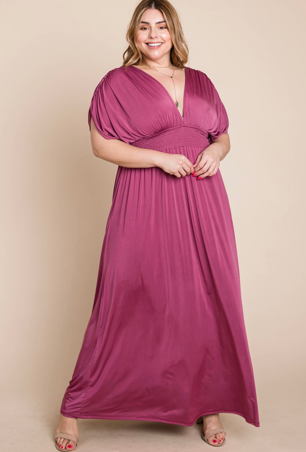 Plus size solid Venezia V-neckline maxi dress with ruched sleeves, smocked waist line open back bow detail.