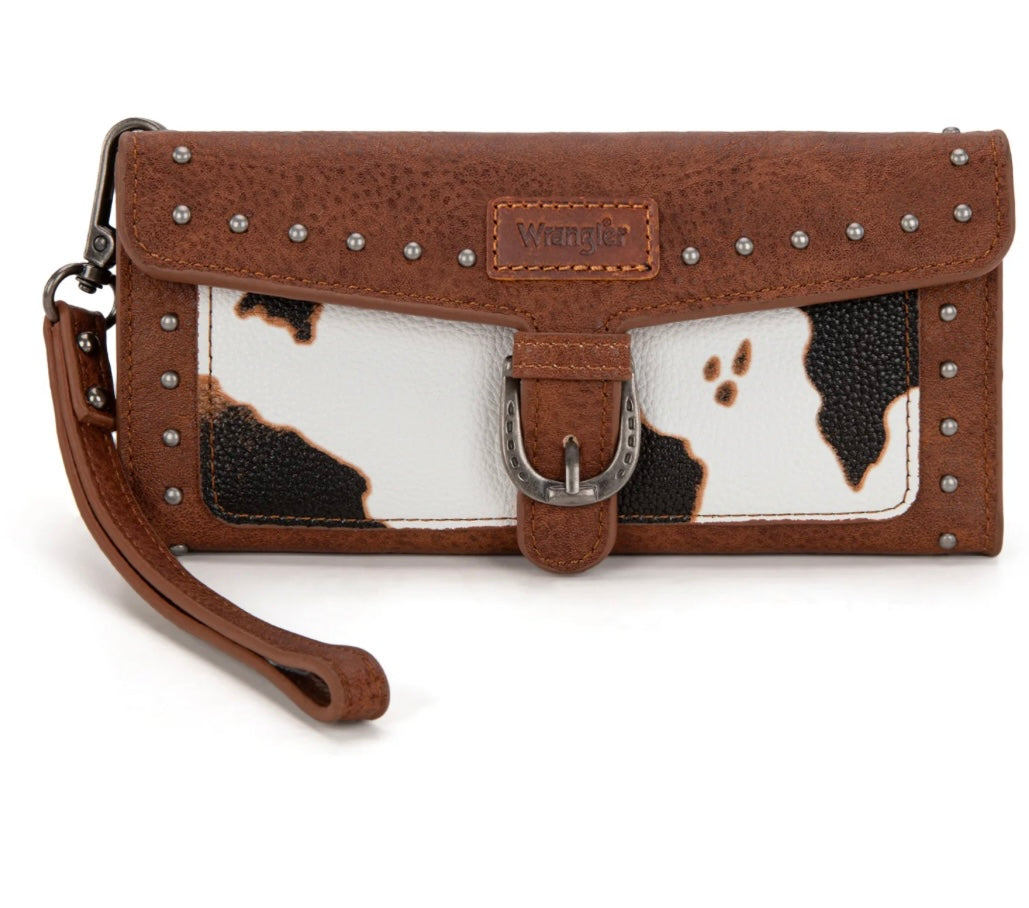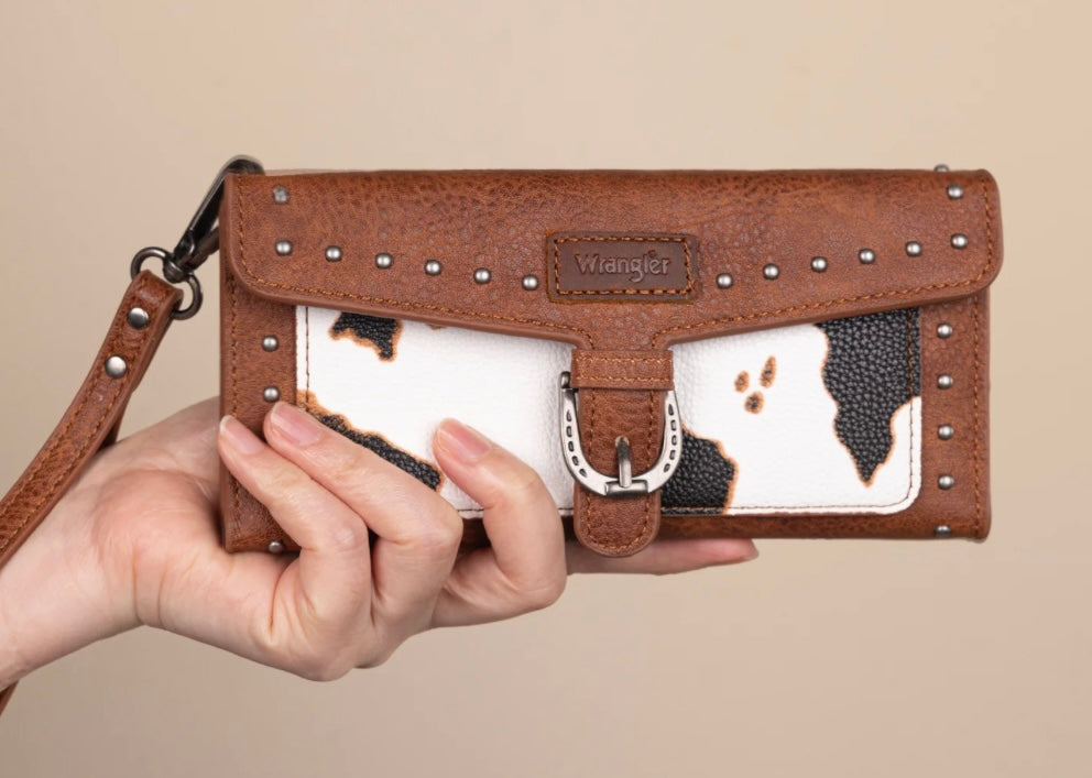 Saddle up in style with this Western cow print wristlet wallet that’s as versatile as it is eye-catching. Crafted from soft PU leather and accented with silver studs and the signature Wrangler logo, this wallet is built for bold fashion and everyday practicality.