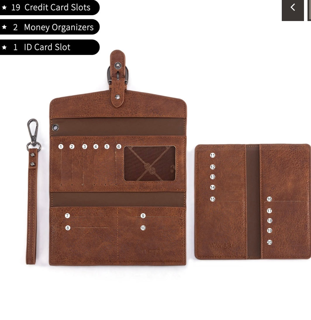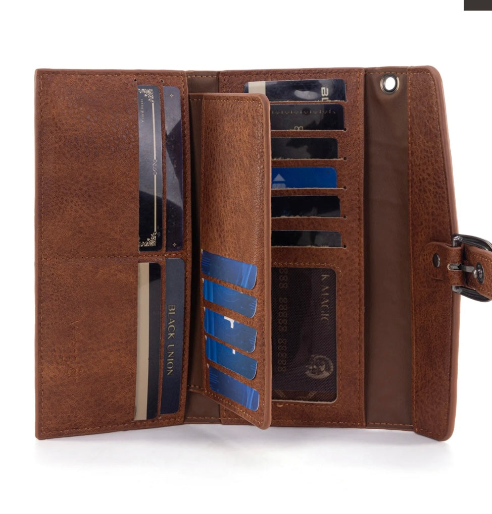 Its unique 2-in-1 detachable design combines a trifold wallet and a removable bifold card holder — making it easy to switch from a full wallet to a grab-and-go card case in seconds. With RFID protection, tons of card slots, and a convertible wristlet strap, this piece is the ultimate mix of security, style, and Western edge.